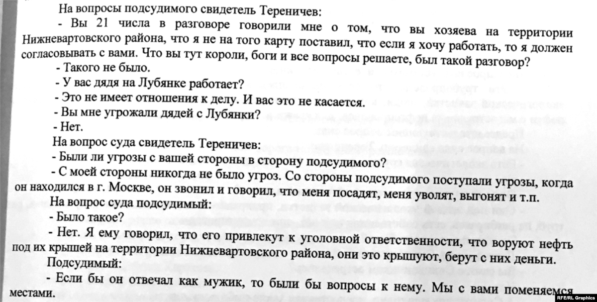 По словам Каратеева, на врезку рядом с одной из его площадок бензовозы приезжали круглосуточно. В июле 2014 года на место работ приехала группа мужчин в балаклавах, рабочих сильно избили, двое человек попали в больницу. Как рассказывал впоследствии Каратеев, единственным человеком с открытым лицом был оперуполномоченный лангепасского отдела ФСБ Алексей Тереничев (о нем мы писали выше): "После этого он мне позвонил и сказал: "Ты понял теперь, кто здесь хозяева? Я, – говорит, – хочу сказать одно: если ты что-то делать тут хочешь в округе, то должен с нами договариваться. А если не будешь, то мы трудолюбивые и продолжим", – рассказывал Каратеев в интервью журналисту Шмонину и на допросах по своему делу. На объяснения эколога, что его деятельность не приносит дохода, ему, по его словам, предложили не заморачиваться с рекультивацией. Каратеев от предложения отказался. Как утверждает Каратеев, Тереничев был лишь "пешкой" – сам аппаратного веса не имел, выполнял указания руководства, в частности майора Евгения Жилина.