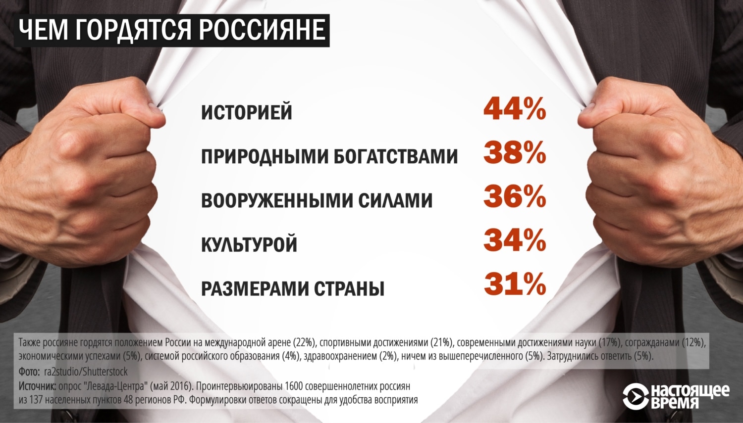 Кроме основных объектов гордости (история – 44%, природные богатства – 38%, вооруженные силы – 36%, культура – 34%, размеры страны – 31%), россияне также говорили, что гордятся положением России на международной арене (22%), спортивными достижениями (21%), современными достижениями науки (17%), согражданами (12%), экономическими успехами (5%), системой российского образования (4%), здравоохранением (2%). Ничем из вышеперечисленного не гордятся 5%, еще 5% затруднились ответить.
